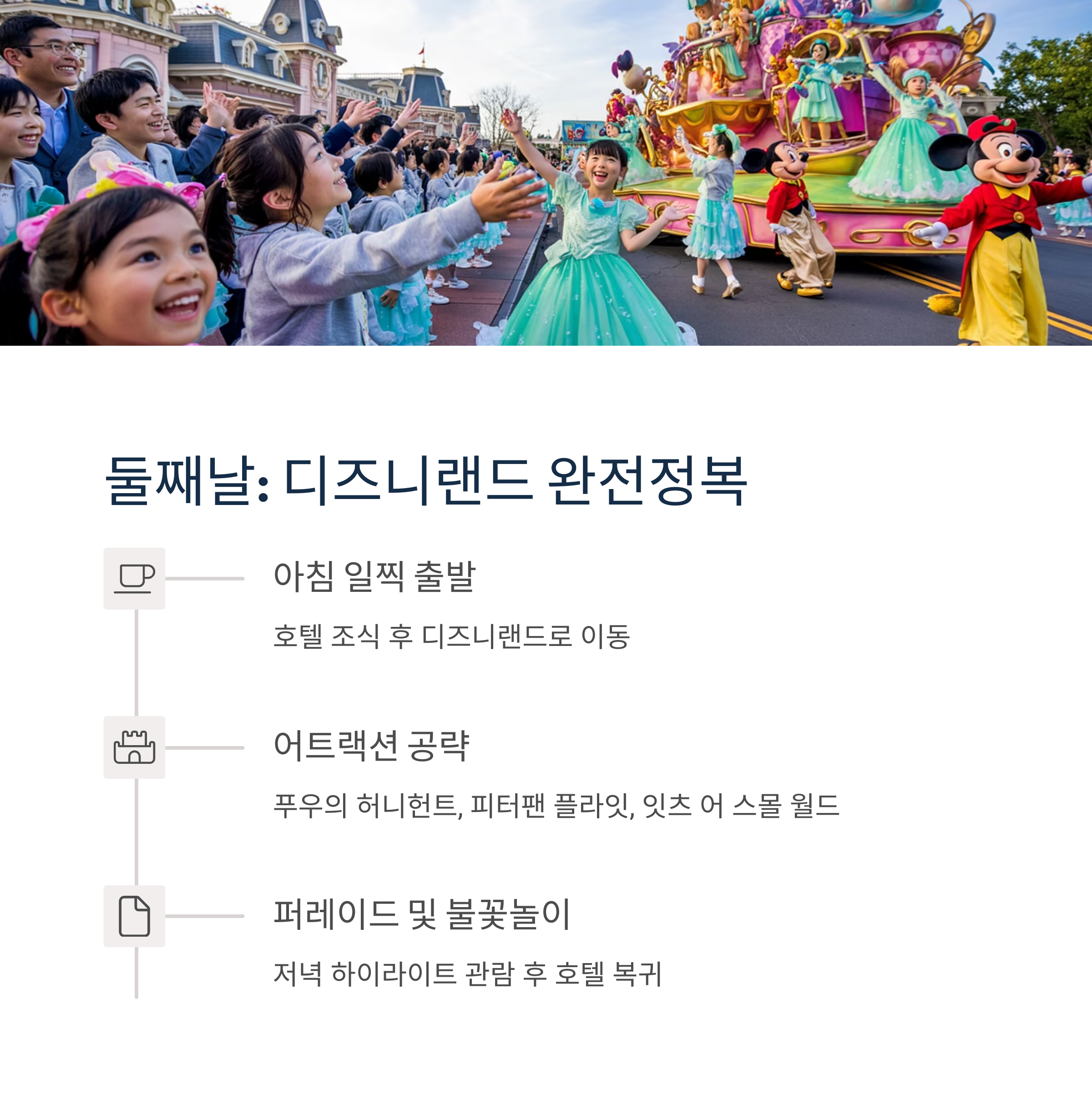 - 아침 일찍: 호텔 조식 후 디즈니랜드로 출발