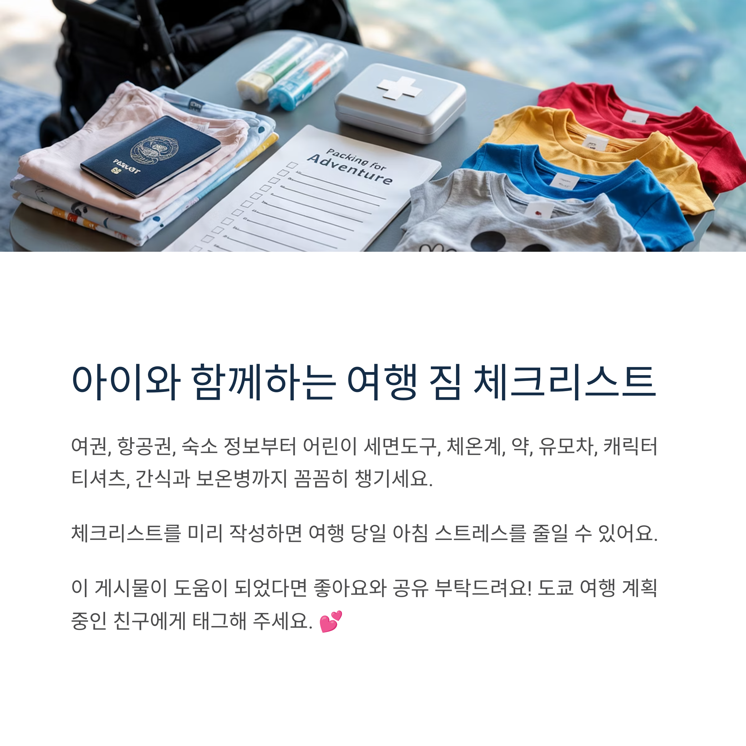 "체크리스트를 미리 작성하면 여행 당일 아침 스트레스를 줄일 수 있어요."