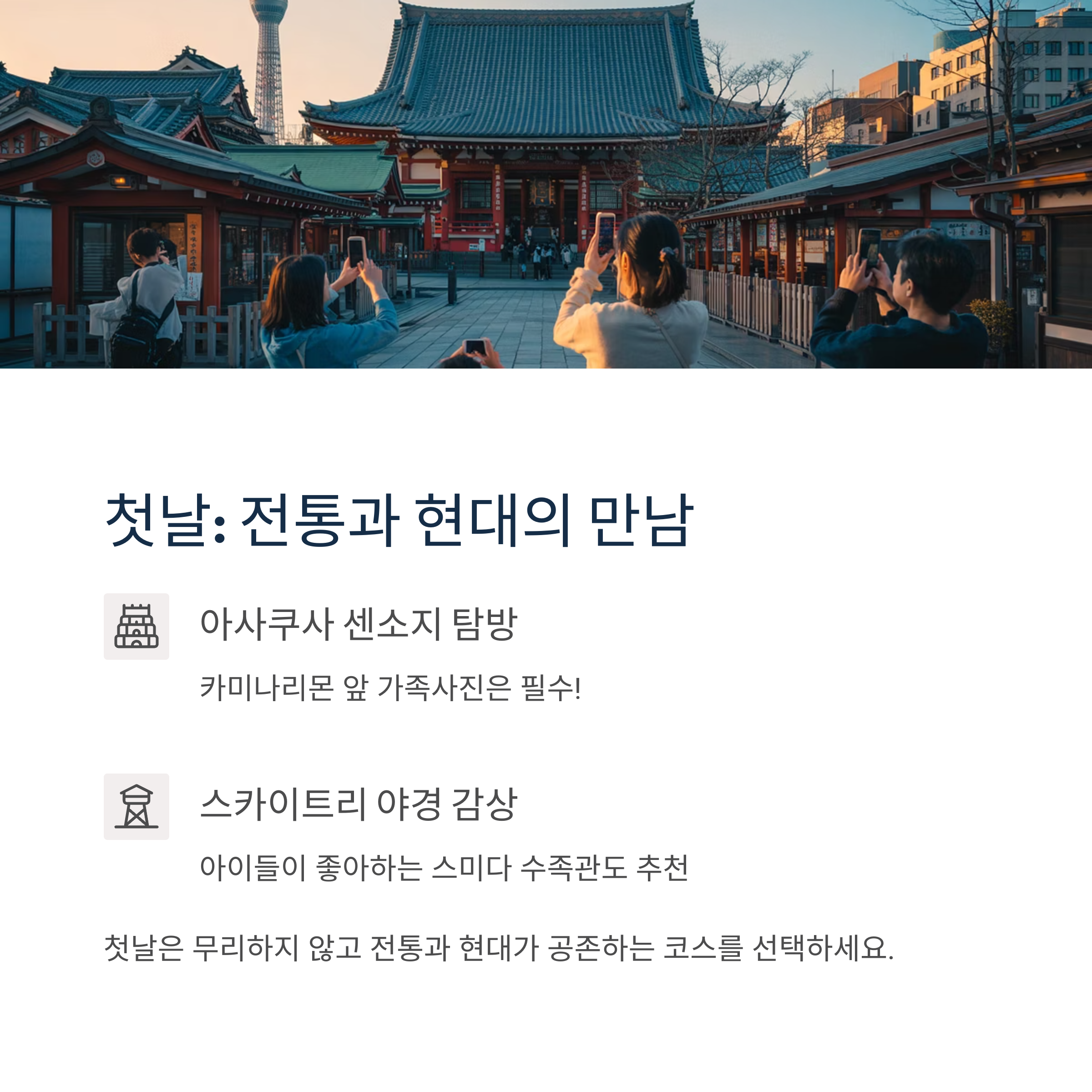 "첫날은 무리하지 않고 전통과 현대가 공존하는 코스를 선택하는 게 핵심입니다."