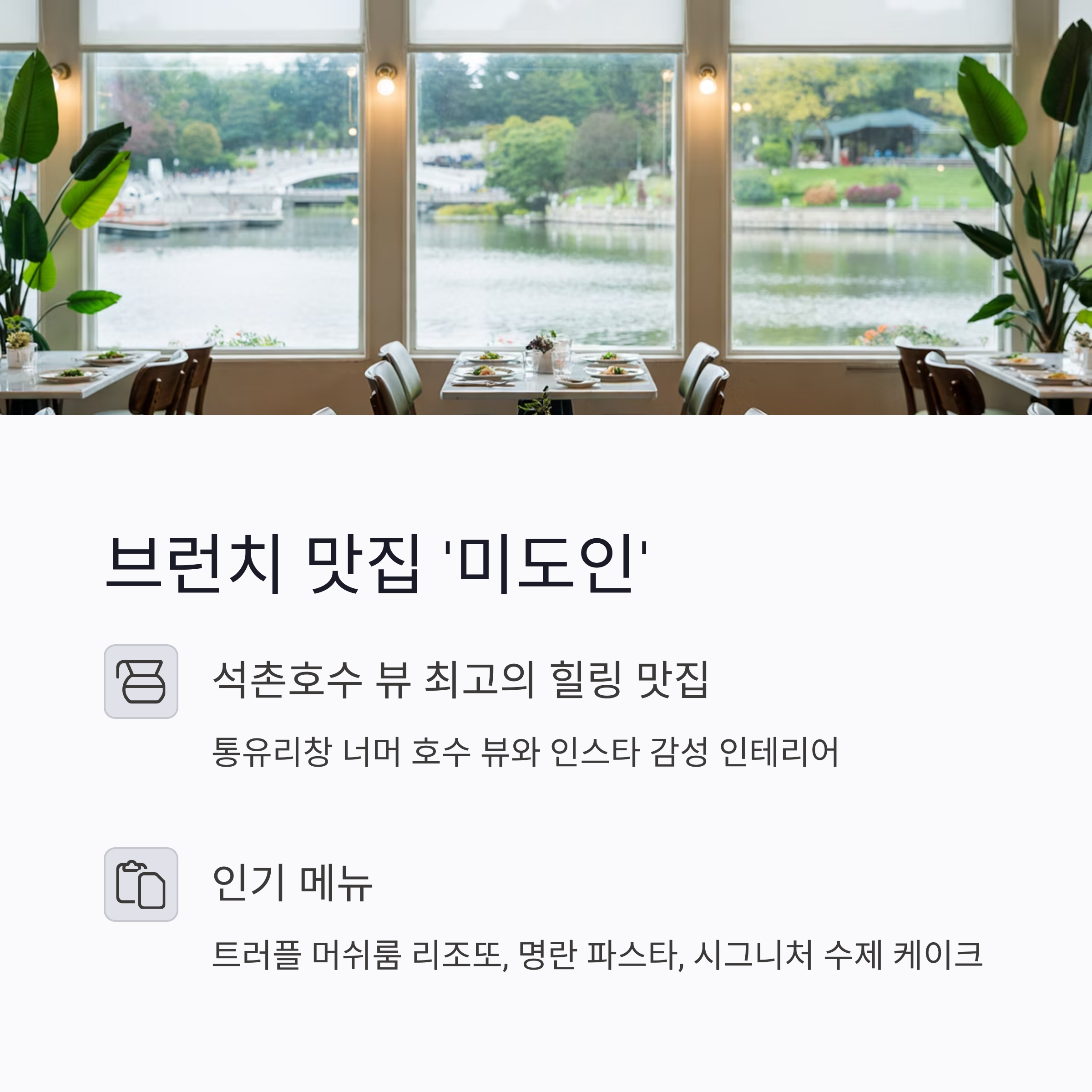 1. 브런치 맛집 '미도인' - 석촌호수 앞 감성 충전 100%