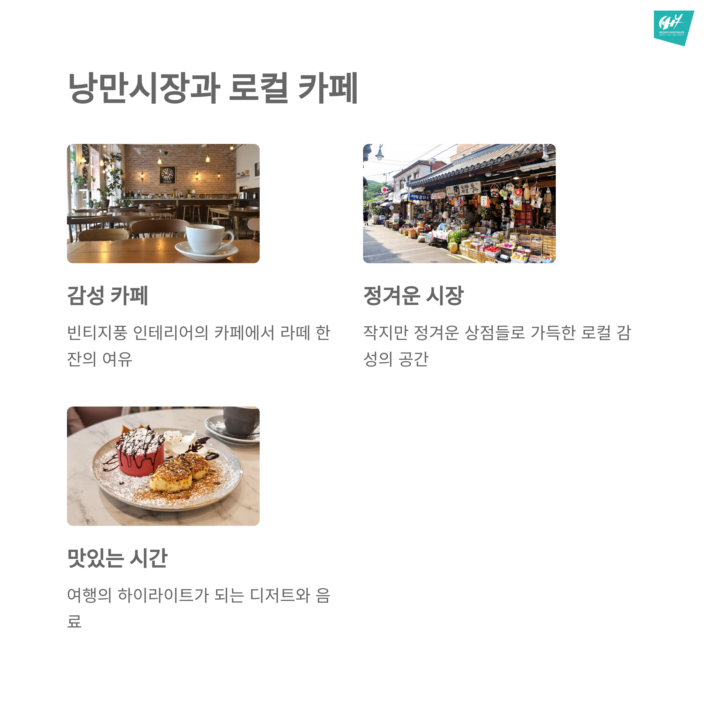 | 낭만시장 & 로컬카페 | 감성적인 골목 + 디저트 즐기기 | 오후 3~4시 |