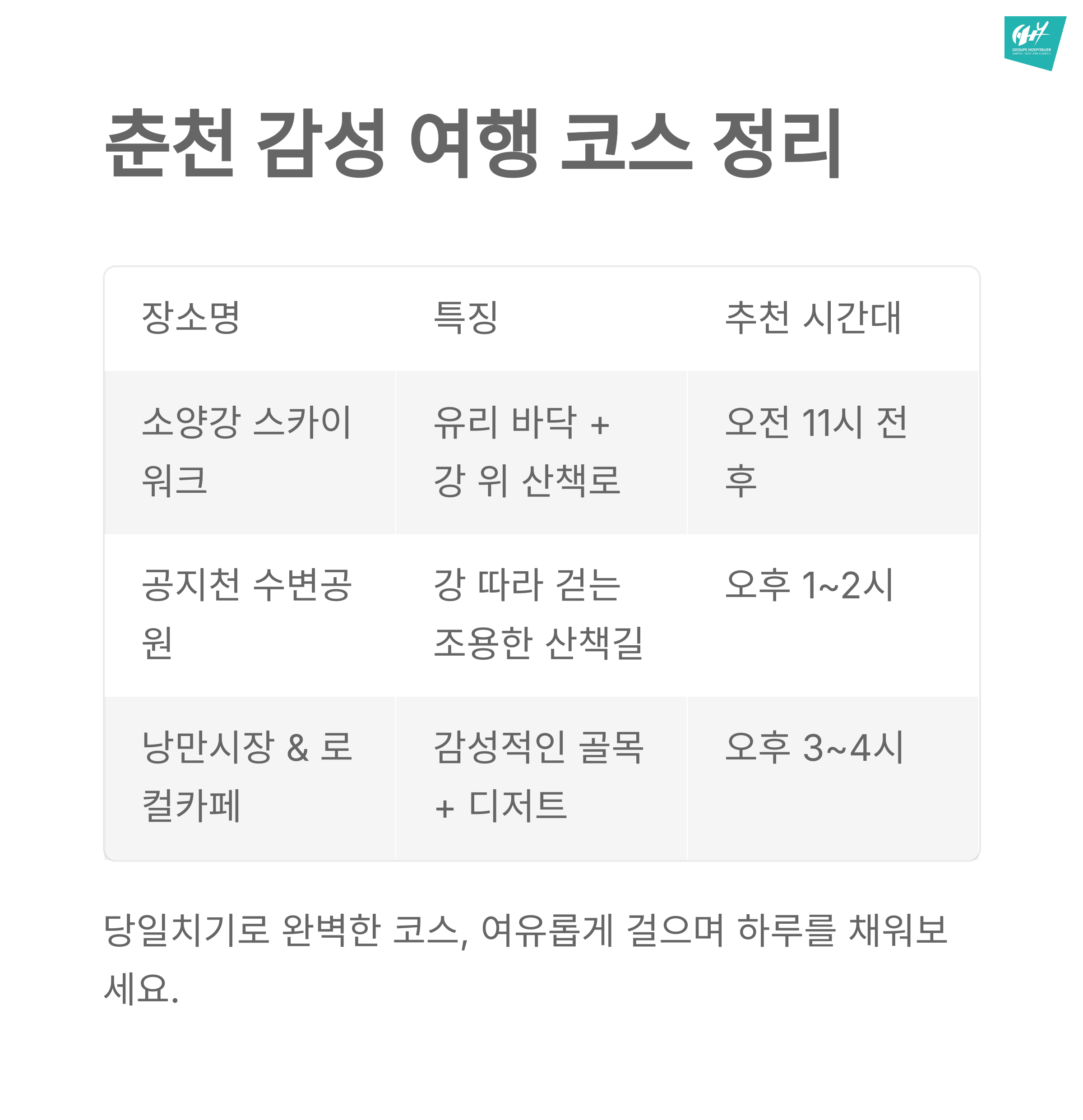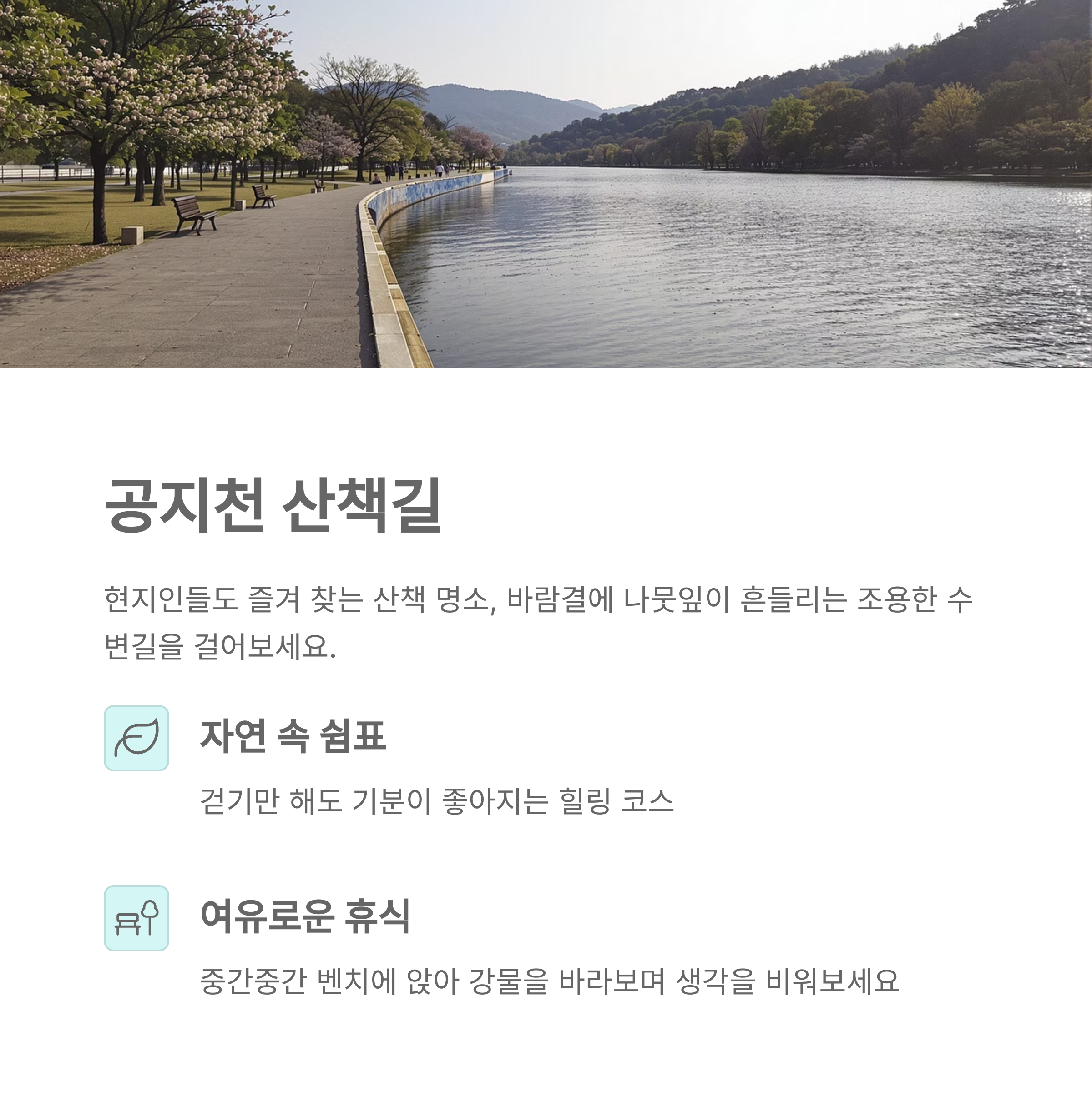 | 공지천 수변공원 | 강 따라 걷는 조용한 산책길 | 오후 1~2시 |