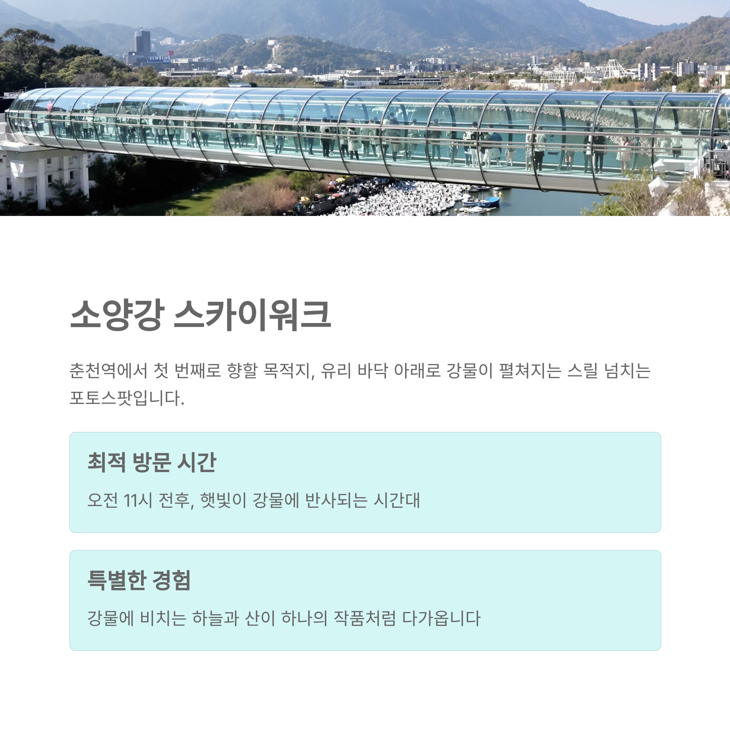 | 소양강 스카이워크 | 유리 바닥 + 강 위 산책로 | 오전 11시 전후 |