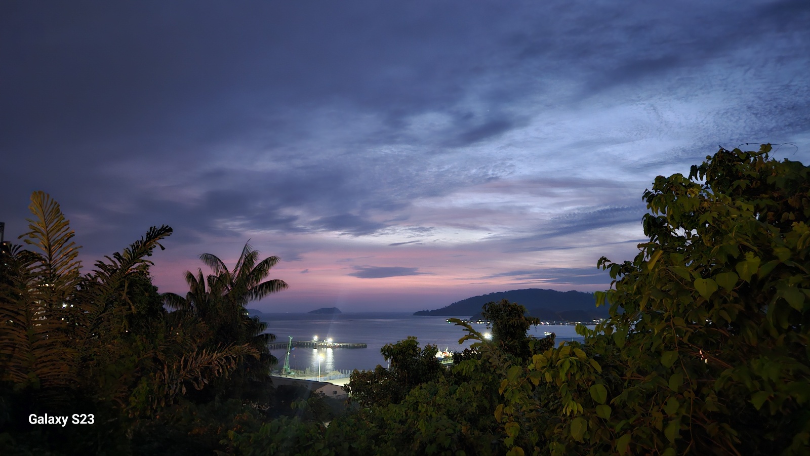 야자수 너머로 번져가는 붉은 빛, 저 멀리 선착장을 감싸는 황혼,