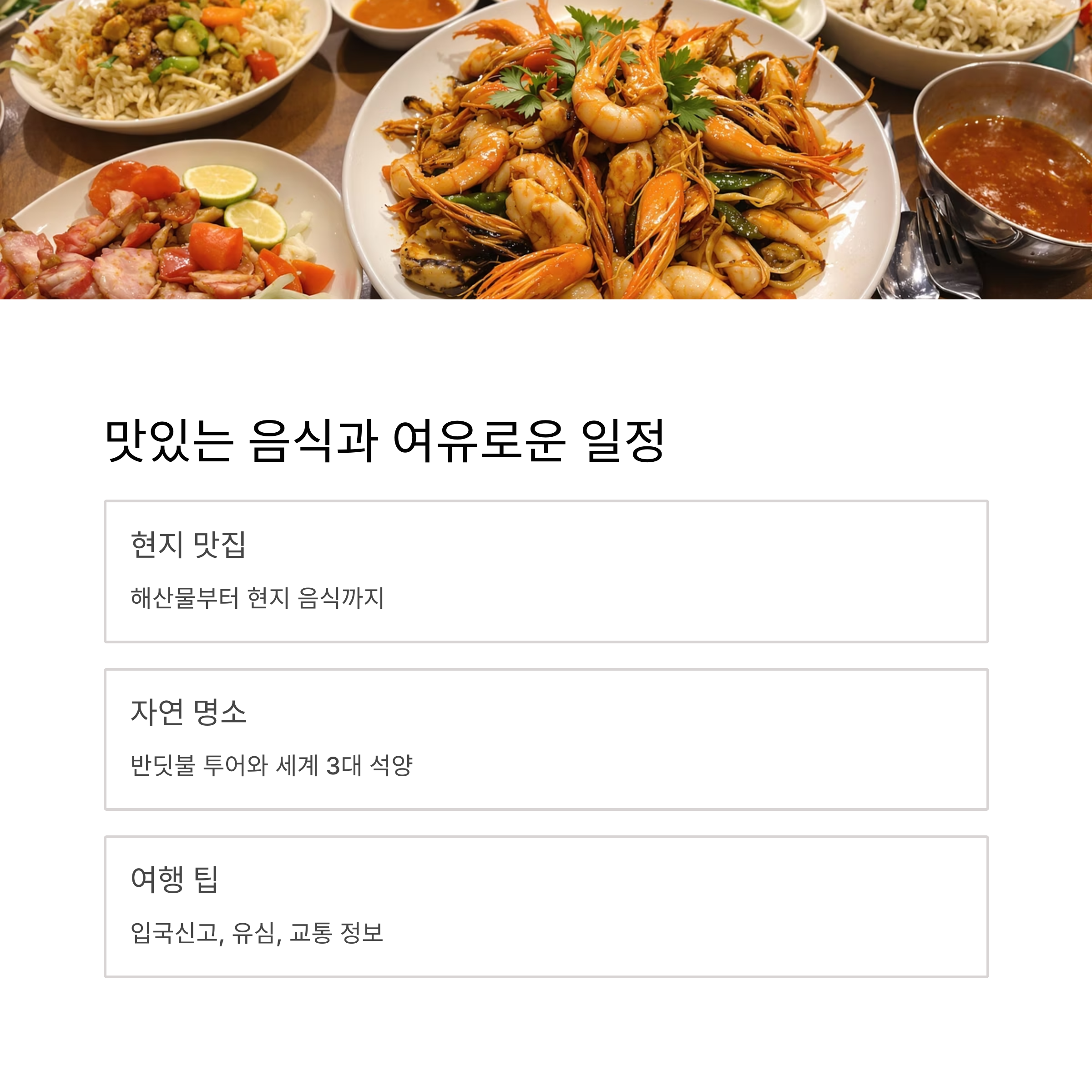 - 맛집 예약: 쌍천씨푸드 등 인기 레스토랑 예약 추천.
