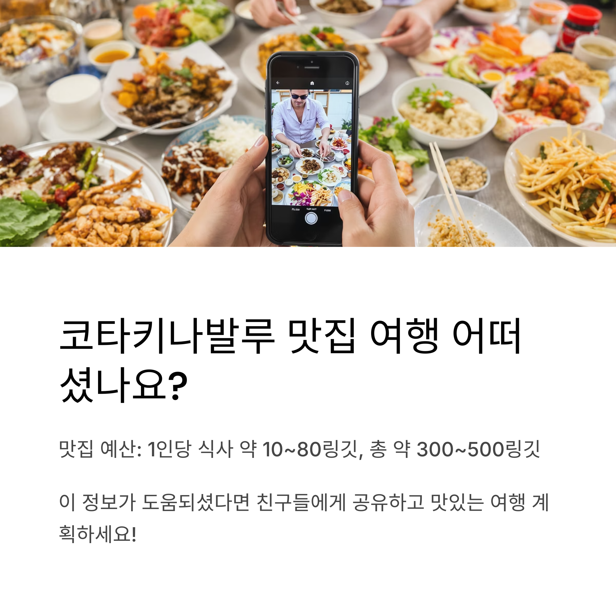 - 맛집 예산: 1인당 식사 약 10~80링깃, 총 약 300~500링깃.