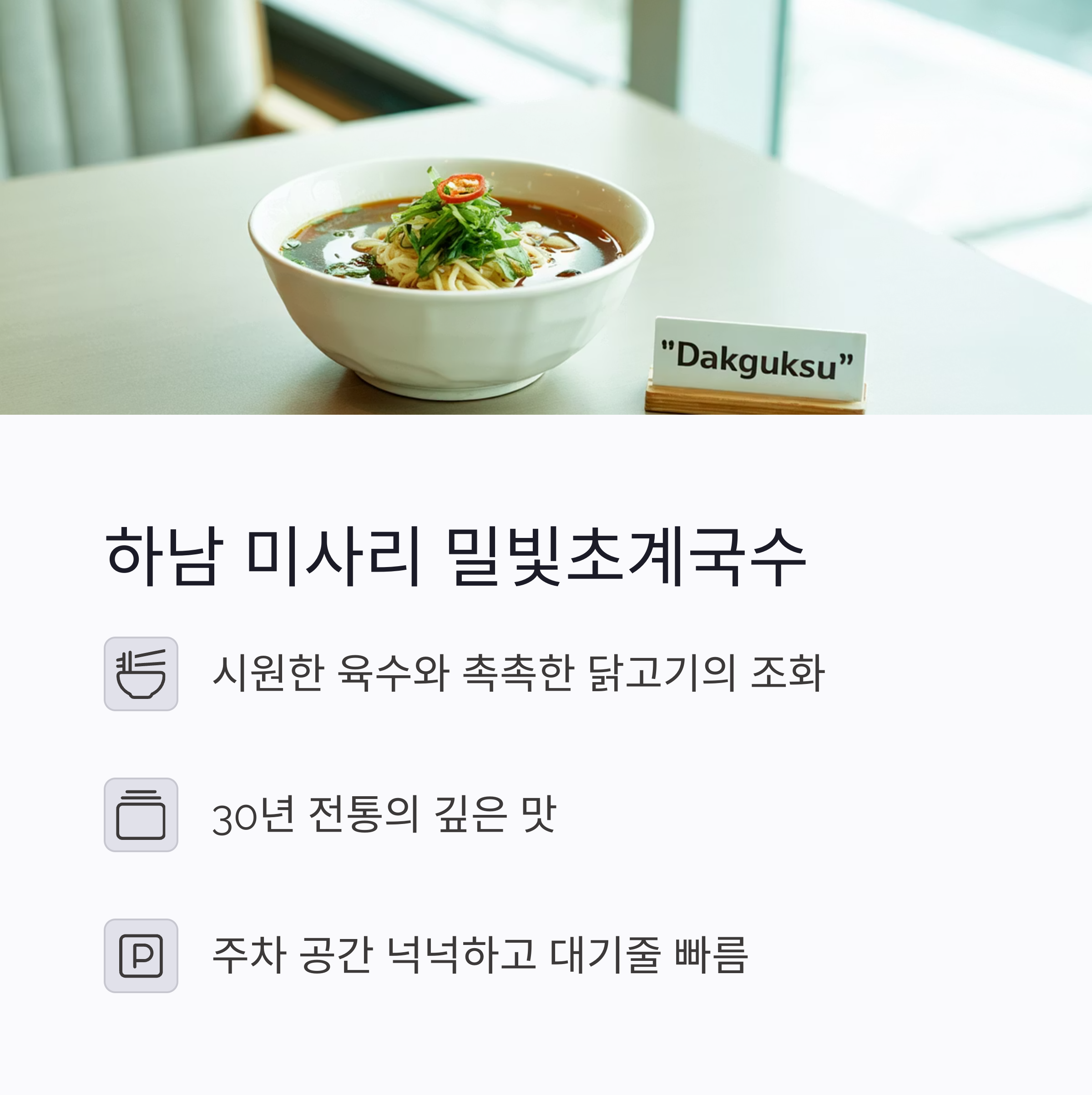 - 시원한 육수와 촉촉한 닭고기의 조화