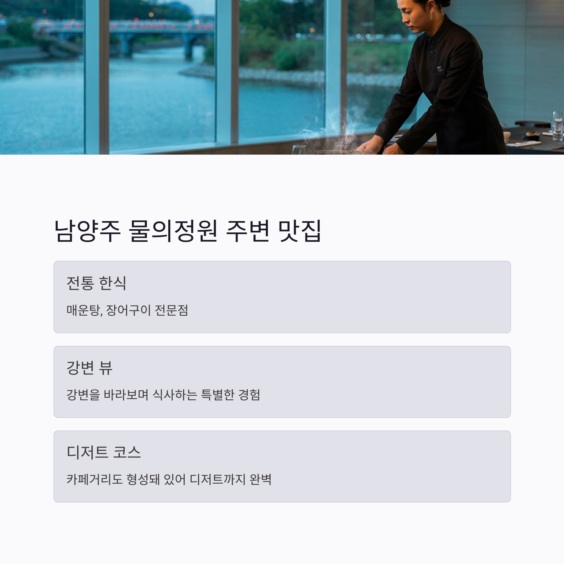 | 남양주 | 물의정원 맛집 | 강변 전망 식당, 매운탕 |