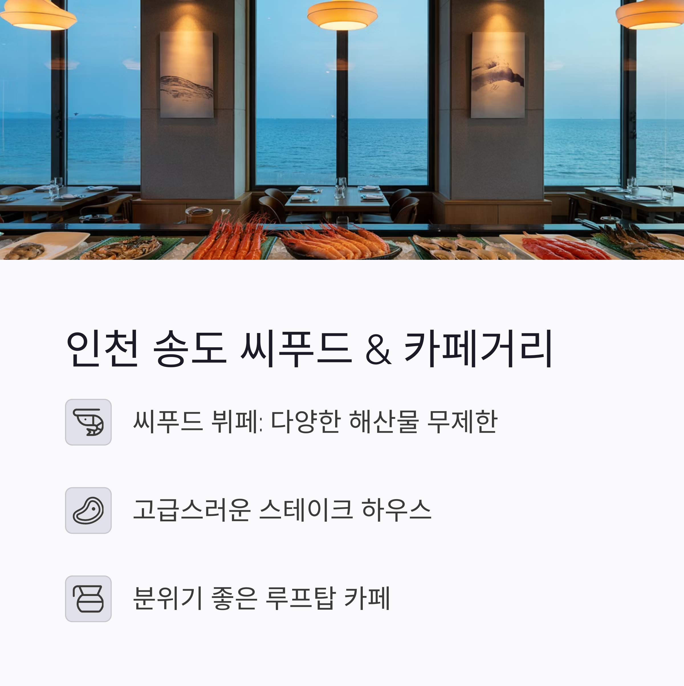 | 송도 | 씨푸드 레스토랑 | 고급 해산물, 바다뷰 |