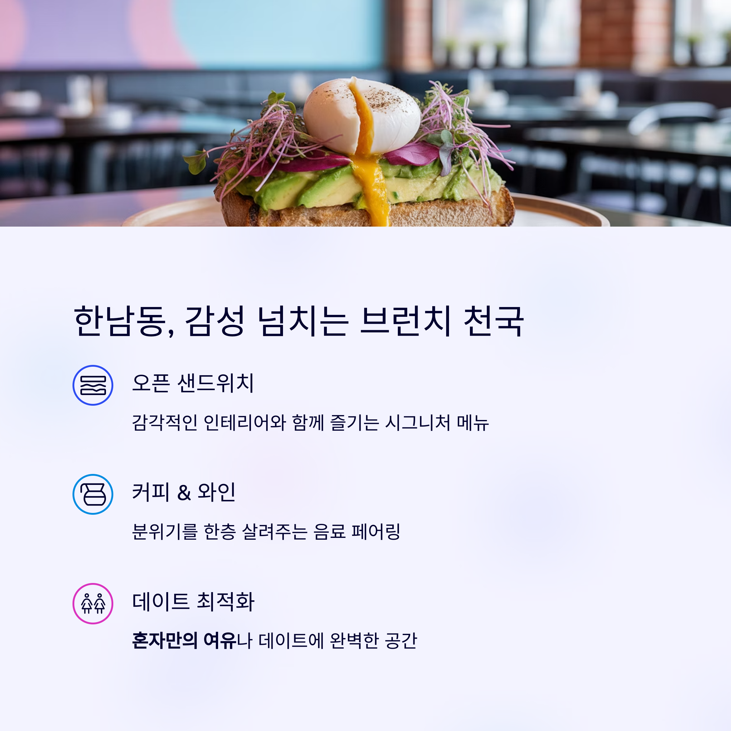 | 한남동 | 감성 오픈 샌드위치 | 혼자 혹은 데이트용 |