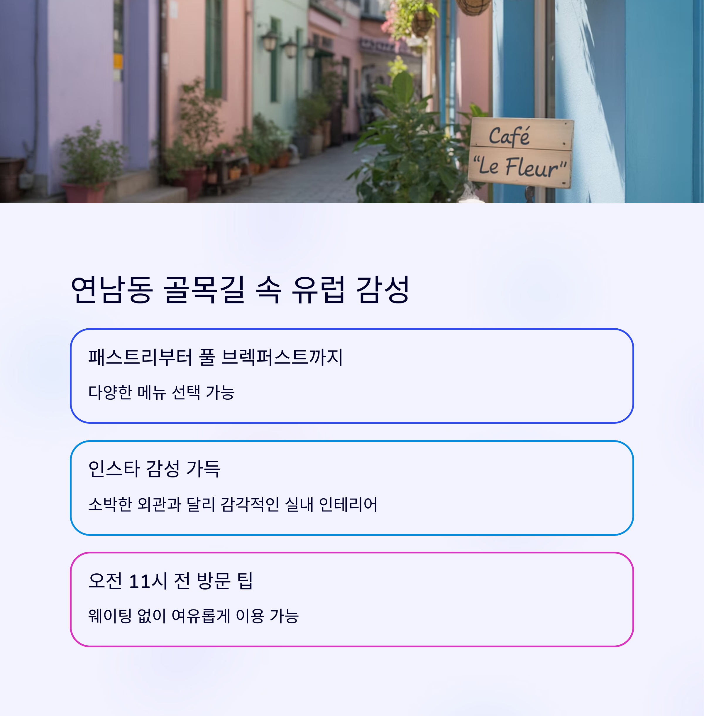 | 연남동 | 유럽식 조식 구성 | 골목 탐방형 |