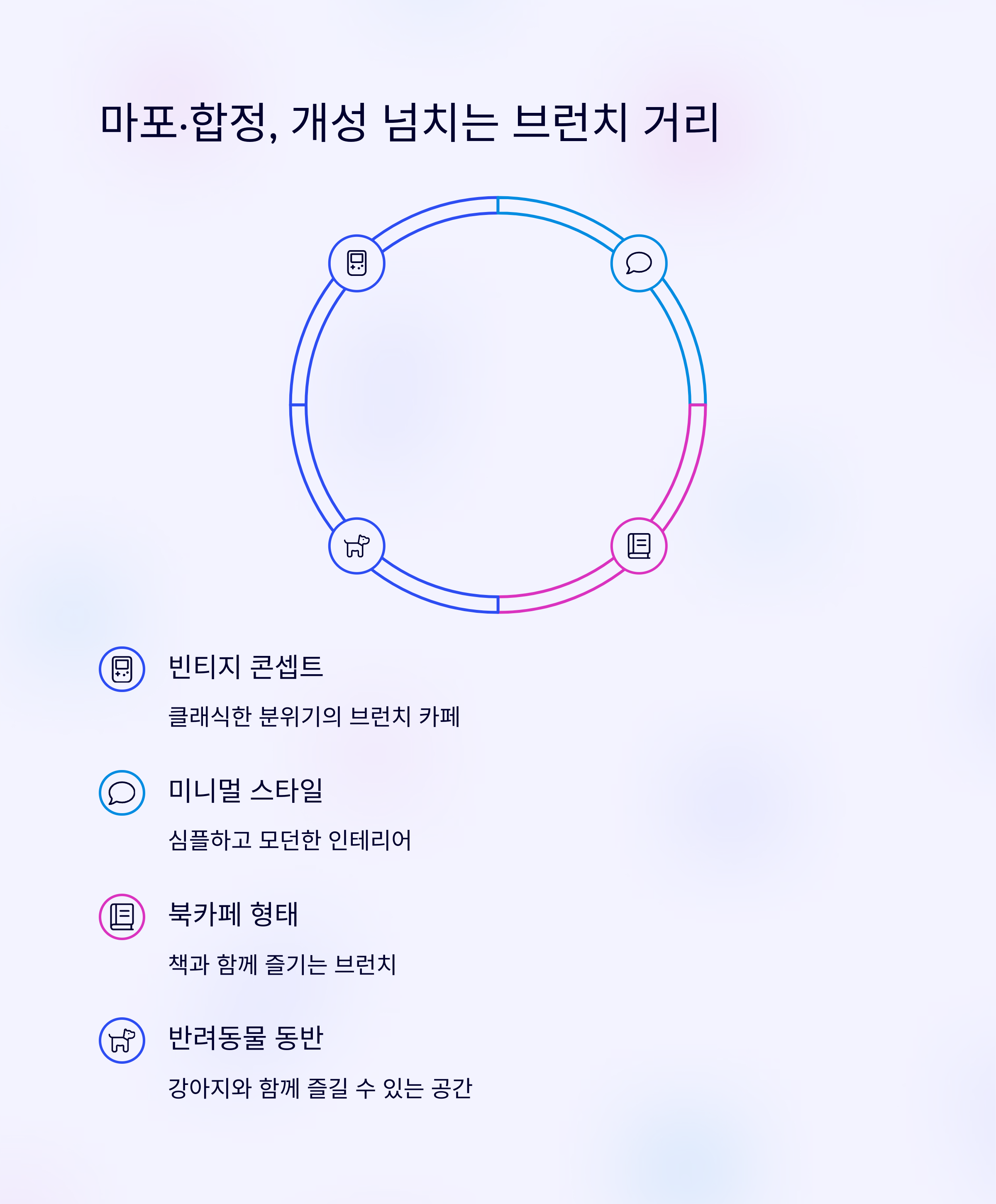 | 마포·합정 | 개성 있는 콘셉트 | 반려동물 동반 가능 |