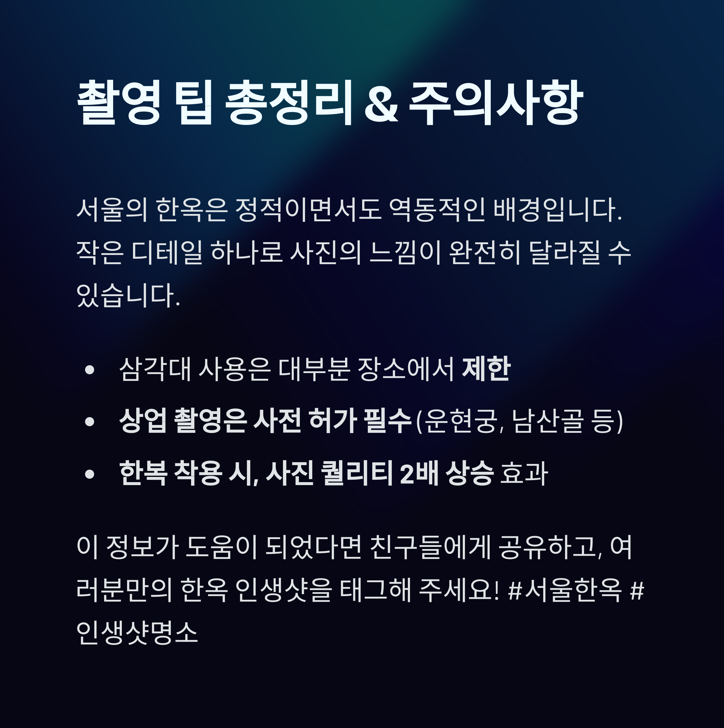 - 상업 촬영은 사전 허가 필수 (운현궁, 남산골 등)