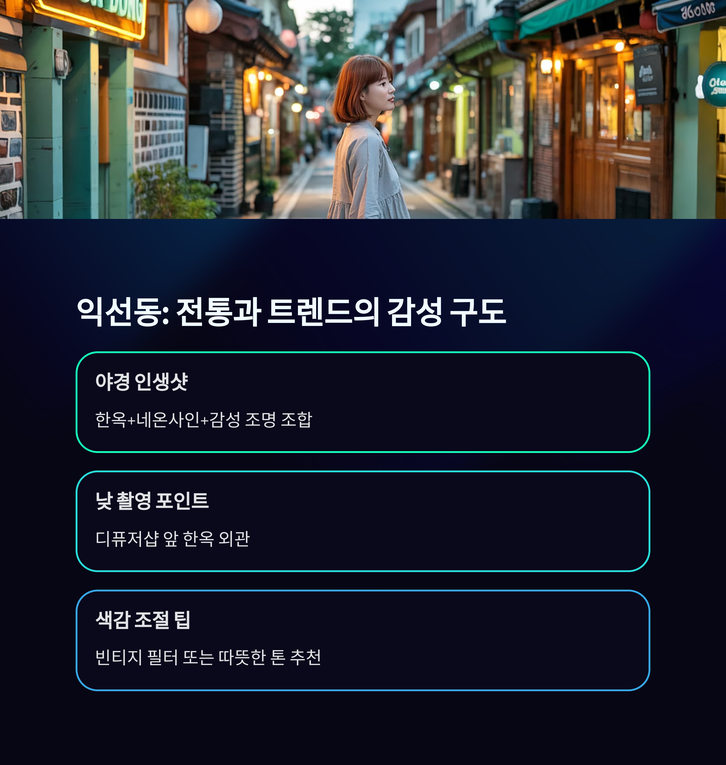 | 익선동 | 감성카페+한옥 조화 | 카페 외벽, 골목길 감성샷 | 오후 3~5시 |