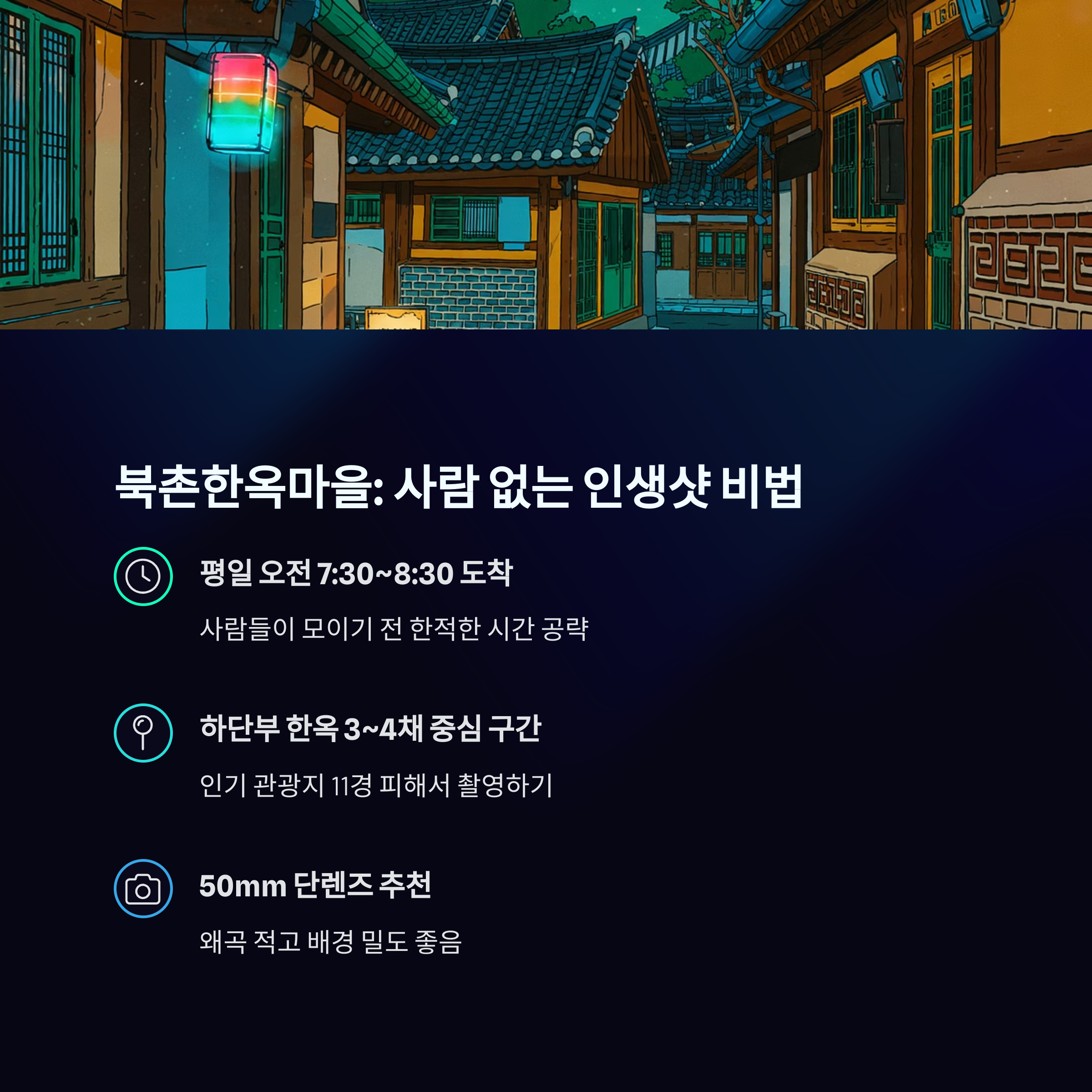 | 북촌한옥마을 | 가장 정통, 유명 | 한옥 사이 골목, 창문 셔터샷 | 오전 9시 전 |