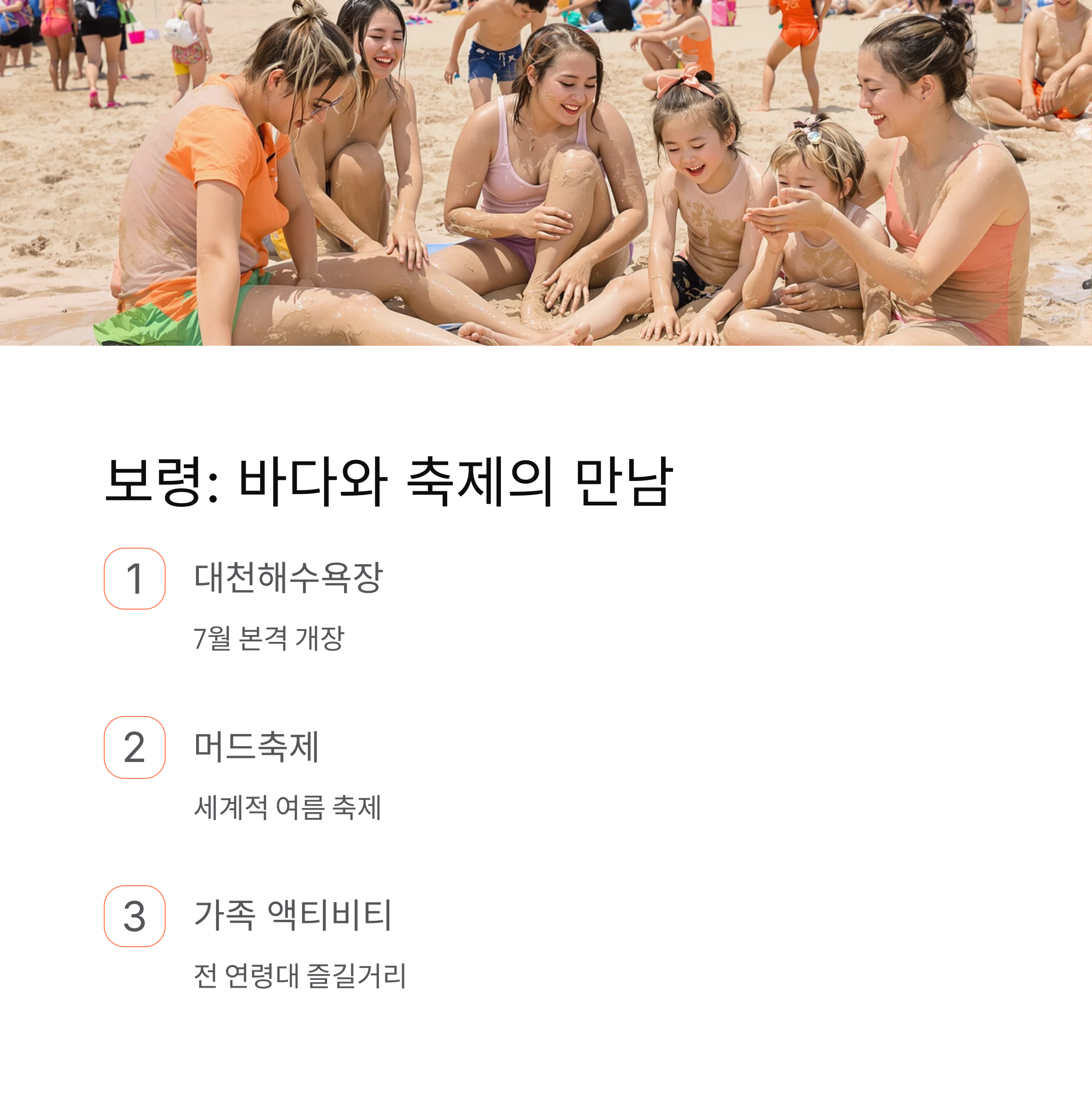 | 보령 | 대천해수욕장, 머드축제, 가족형 이벤트 | 여름 축제+바다 모두 즐길 수 있음 |