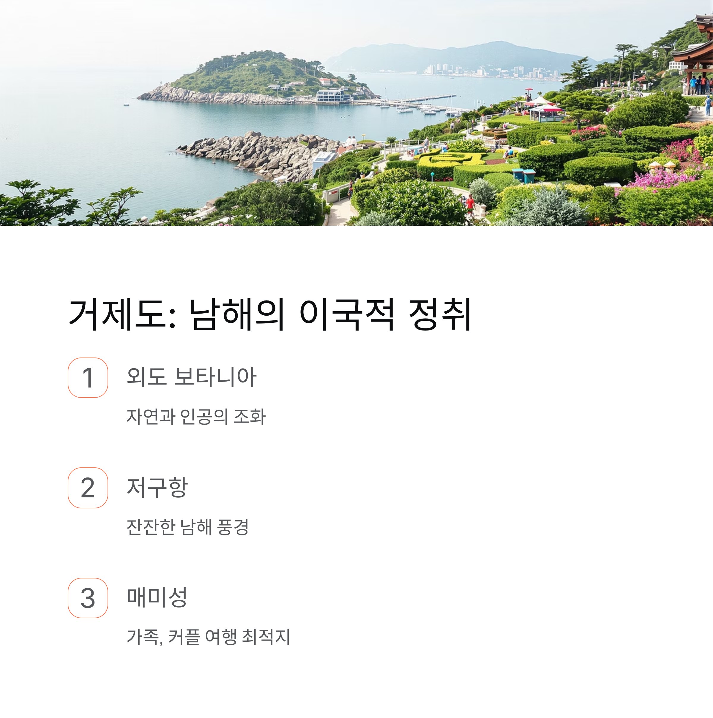 | 거제도 | 외도, 저구항, 매미성, 남해 바다 | 가족·커플 여행에 최적 |