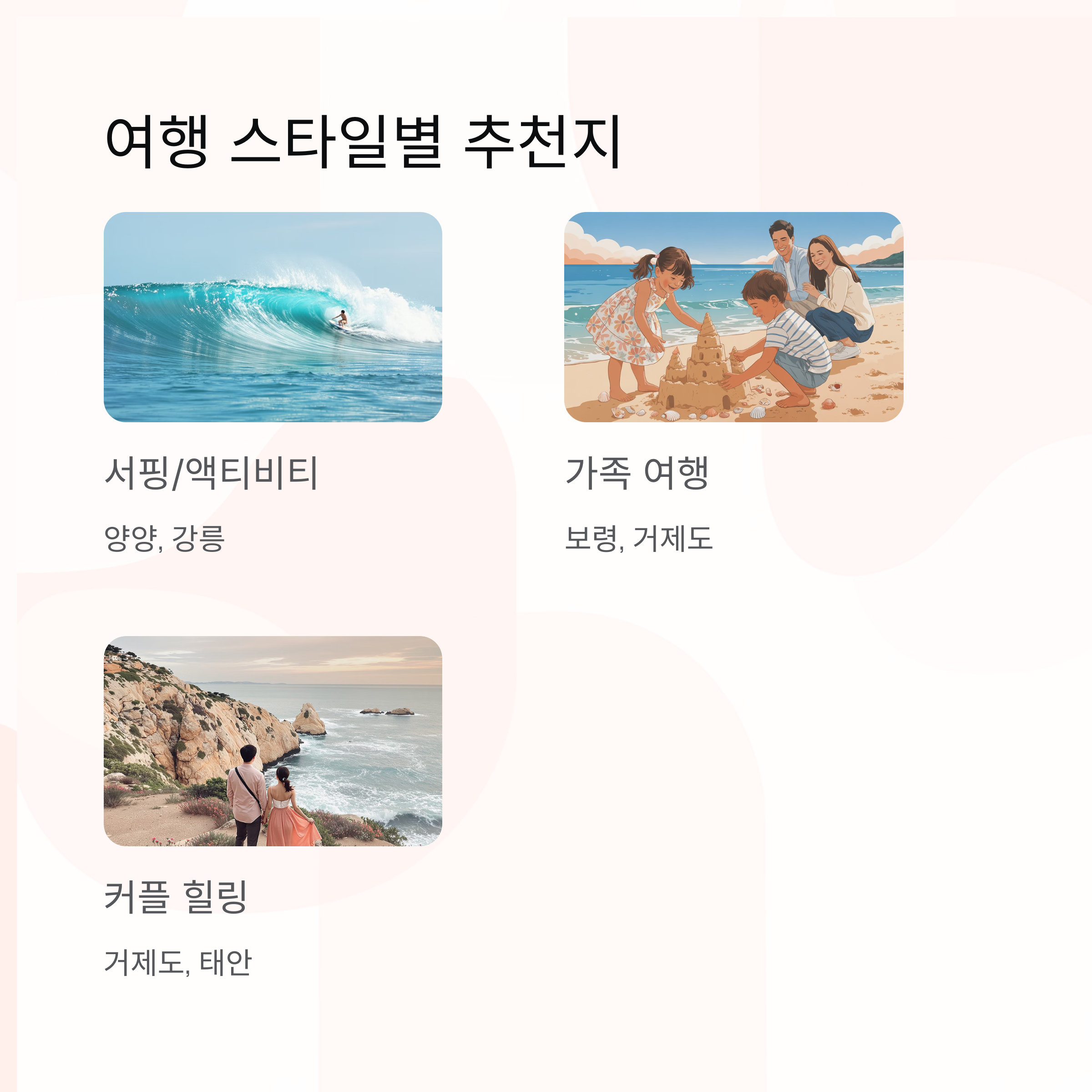 | 서핑/액티비티 | 양양, 강릉 | 서핑, 해변 카페, 감성 숙소 |
