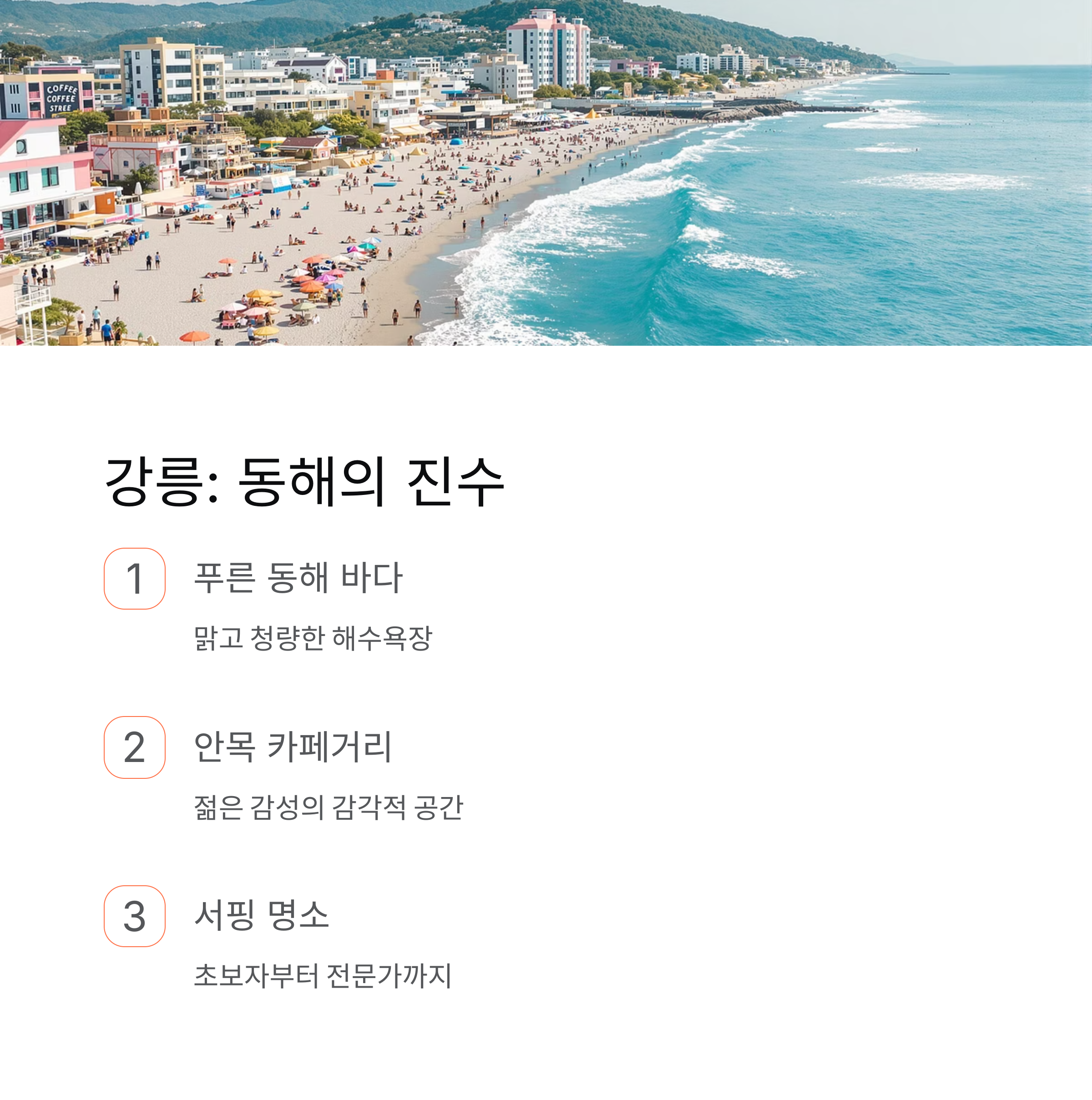 | 강릉 | 동해 해변, 카페거리, 서핑 | 여름 감성 가득한 해변 도시 |
